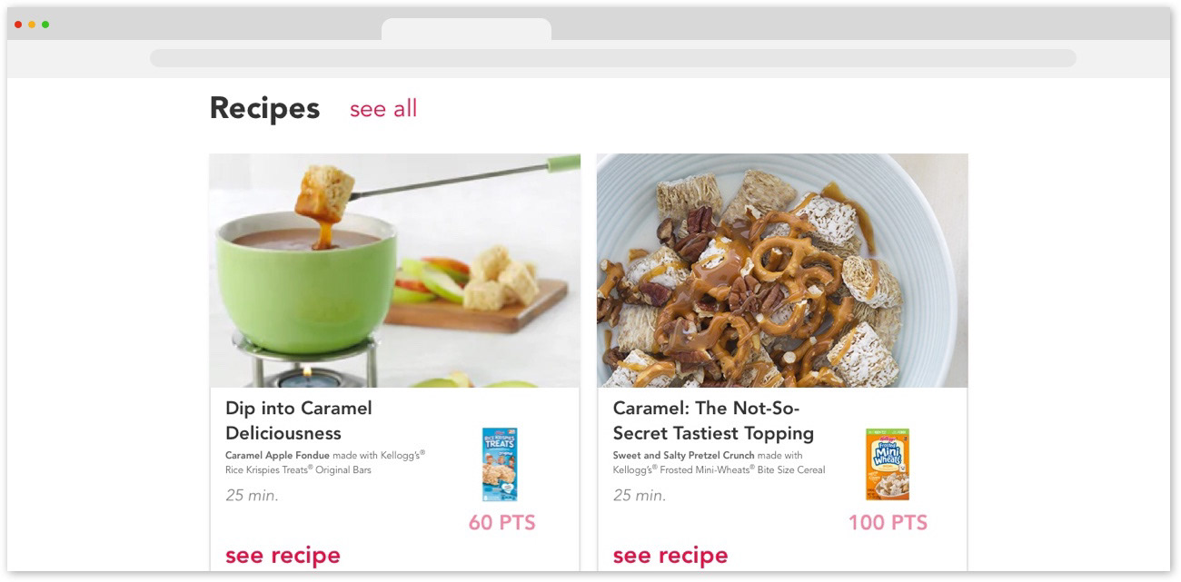 I put recipes on wider cards to play up the appetite appeal of the recipe images. I kept the product shot and point value tucked together and in its own space.